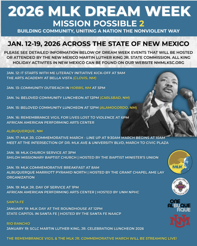 Albuquerque events start January 16, with the Remembrance Vigil at the fairgrounds. The vigil and the Commemorative March will be streamed live. For details, go here.